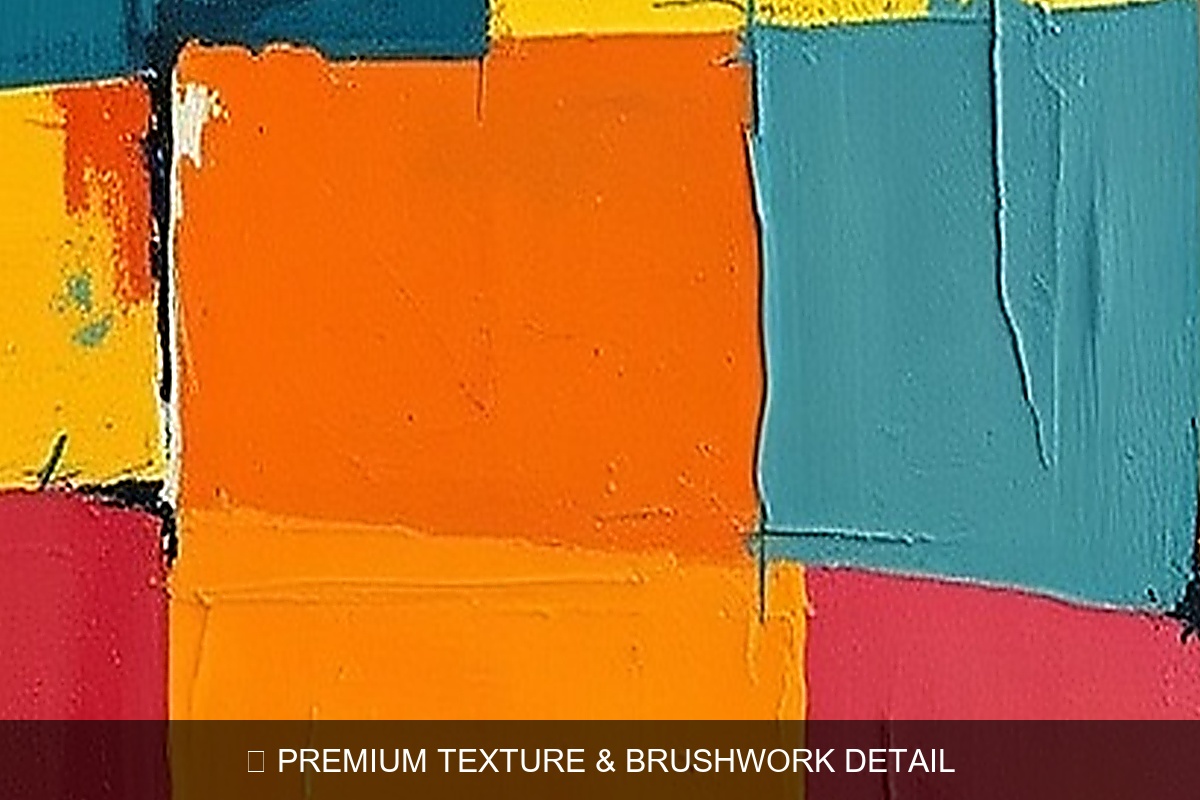 • Abstract Expressionist Masterpiece: Bold geometric color blocks in vibrant gold, cream, and tan create dynamic visual energy.
