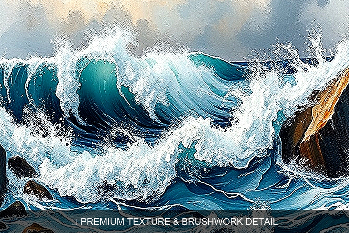 • Abstract Expressionism style capturing the raw power of tempestuous ocean waves in vibrant, dynamic brushstrokes