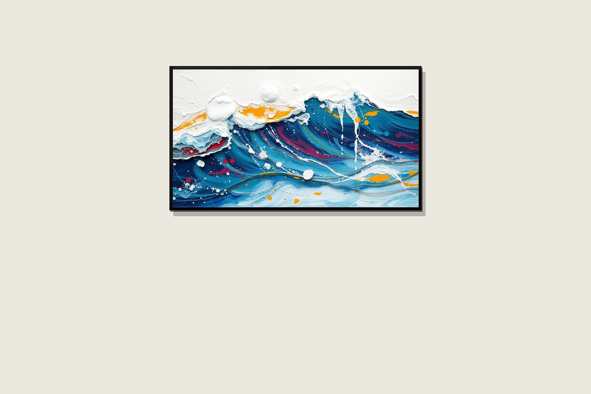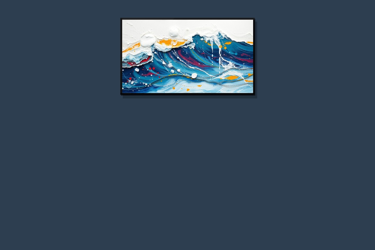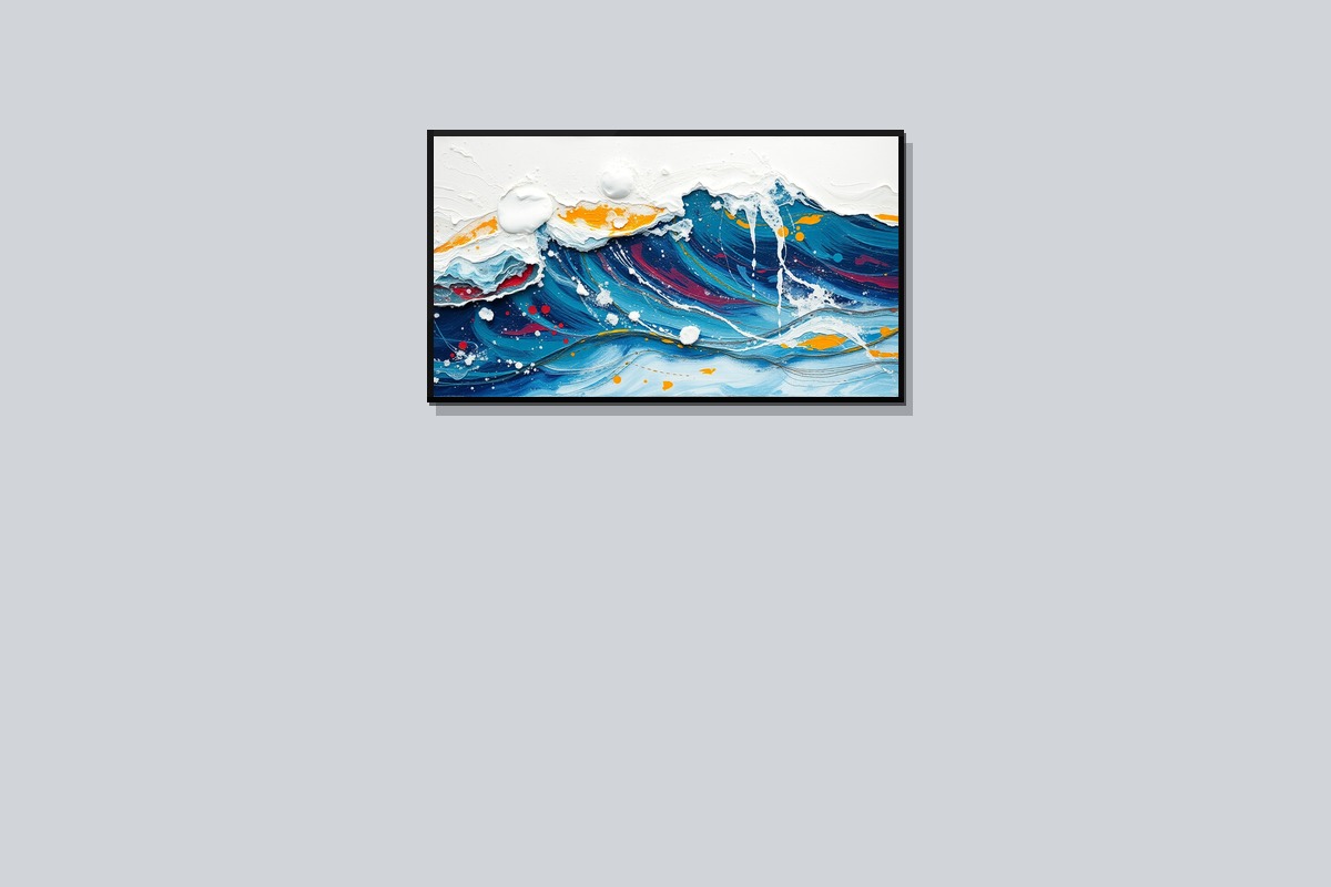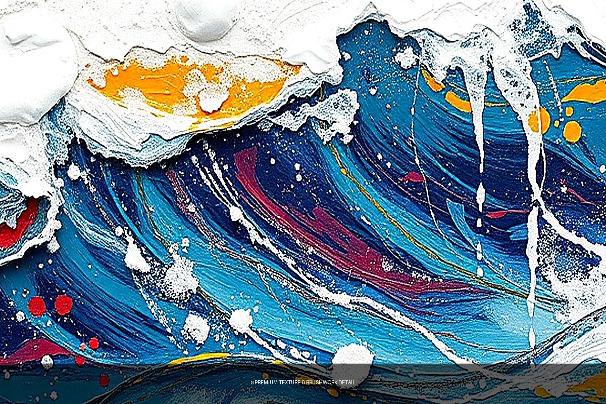 • Captures the raw energy of ocean waves in abstract expressionist style