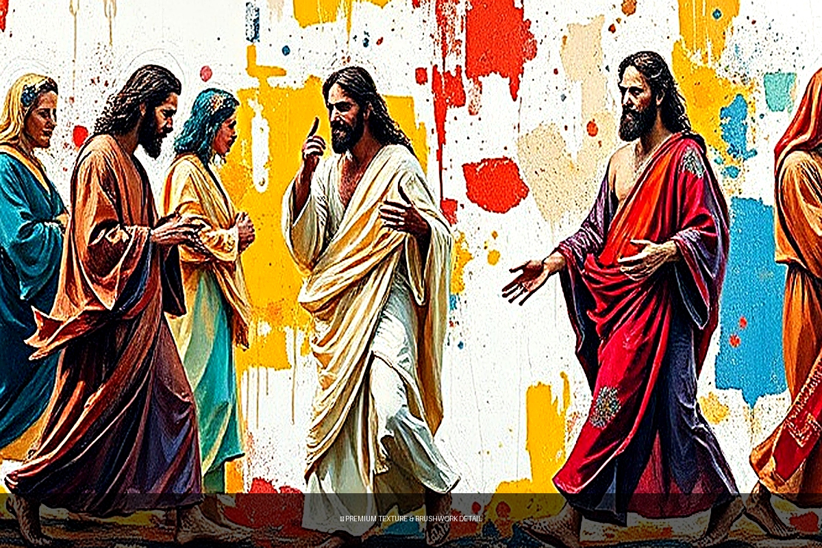 • Captivating abstract interpretation of Jesus walking on water in bold crimson tones
