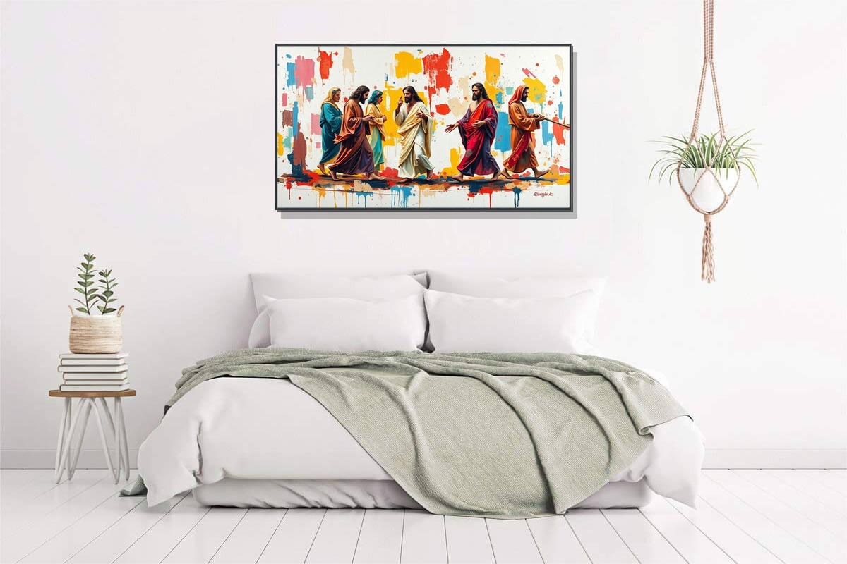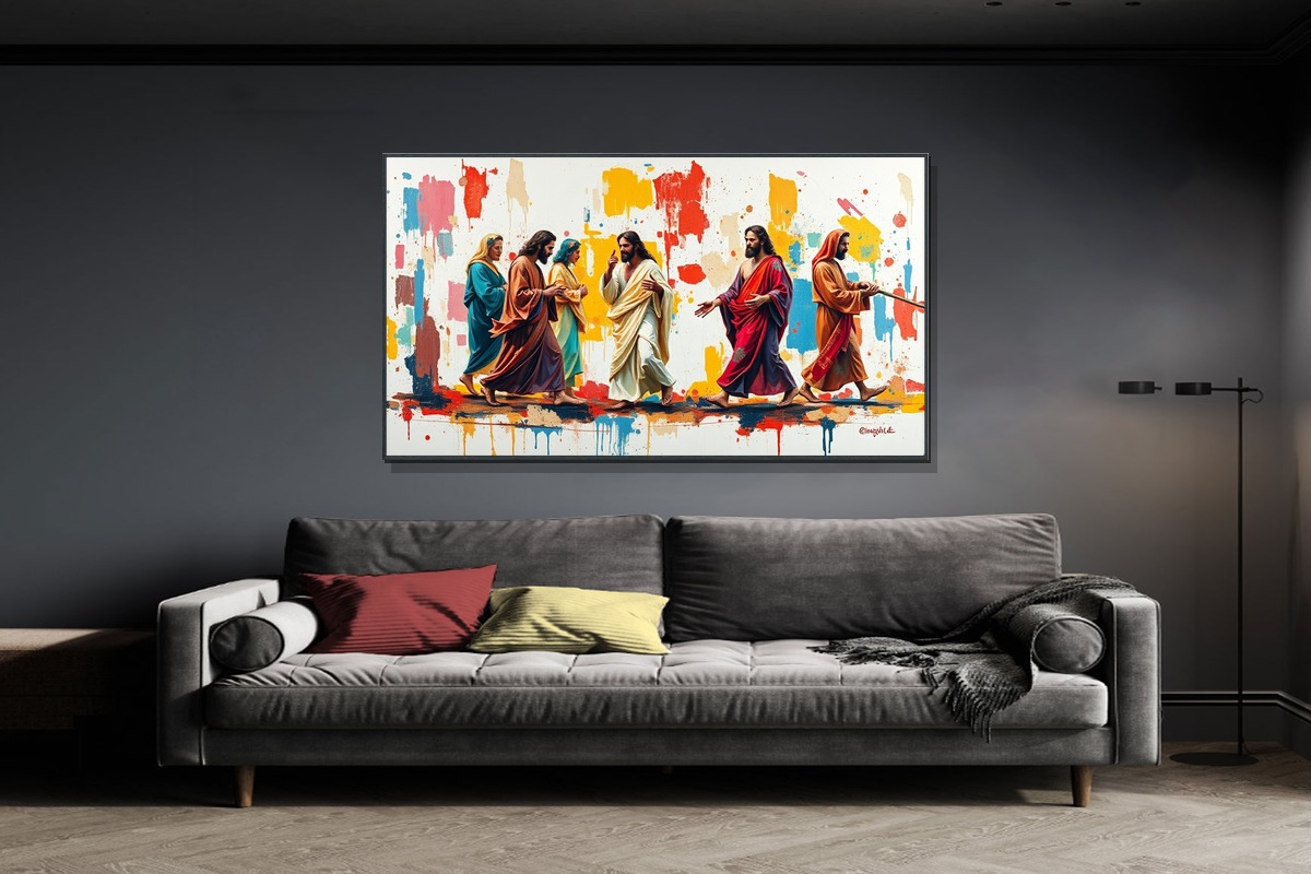 Crimson Journey 380 is a powerful abstract expressionist interpretation of the biblical miracle, where Jesus walks on water. This striking 60x90cm canvas artwork transforms the spiritual narrative through bold crimson hues and dynamic brushwork that capture both the divine presence and turbulent waters. The composition balances ethereal light with textured depth, creating a contemporary religious piece that resonates with both faith and artistic appreciation. Using premium archival materials and professional gallery wrapping techniques, this artwork maintains vibrant colors for years while offering immediate display readiness. Ideal for living spaces, meditation rooms, or spiritual settings, it serves as a conversation piece that bridges traditional symbolism with modern abstract aesthetics.