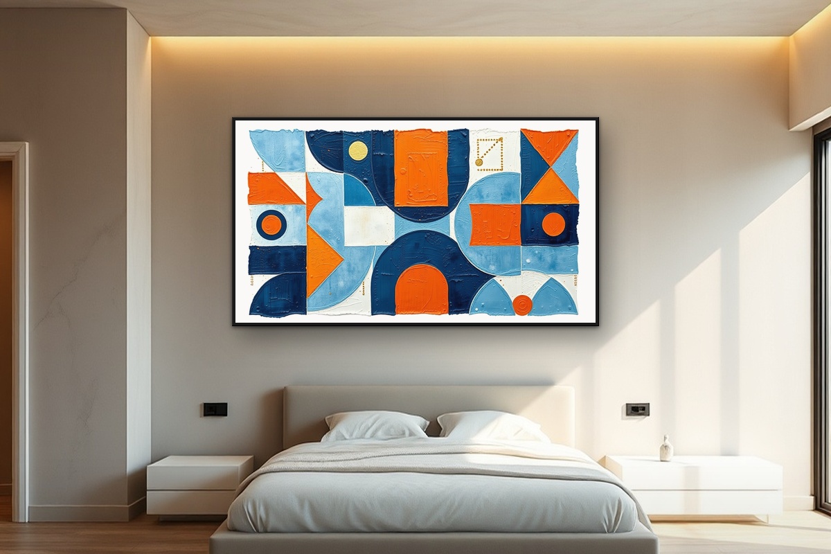 Elevate your living space with this stunning abstract boho wood wall art collection. Inspired by Bauhaus geometric principles and mid-century modern aesthetics, this 3-panel wooden set features vibrant deep blue, warm terracotta orange, and shimmering gold leaf accents. Each panel showcases heavy impasto textures created with professional palette knife techniques, adding dimensional depth and tactile interest. The perfectly balanced composition works beautifully in contemporary living rooms, minimalist bedrooms, or gallery-style spaces. Crafted from premium wood with museum-quality finishes, this statement piece arrives ready to hang and instantly transforms any blank wall into a sophisticated focal point. A thoughtful home gift that brings artistic elegance to modern interiors.